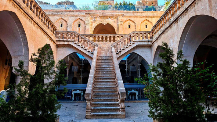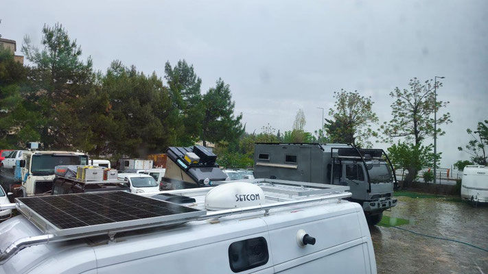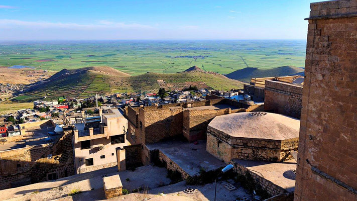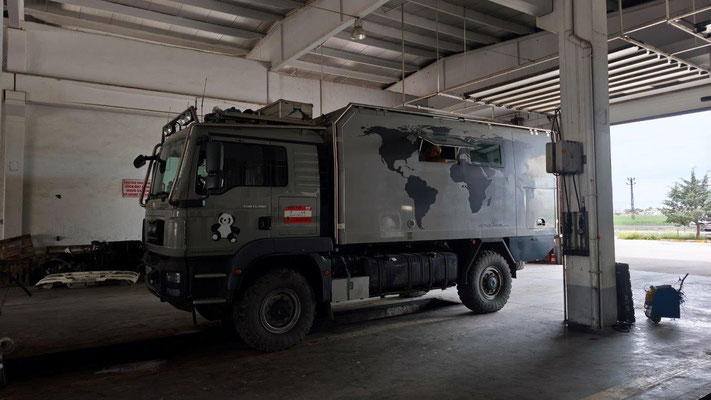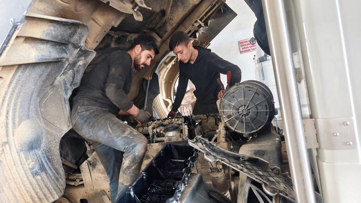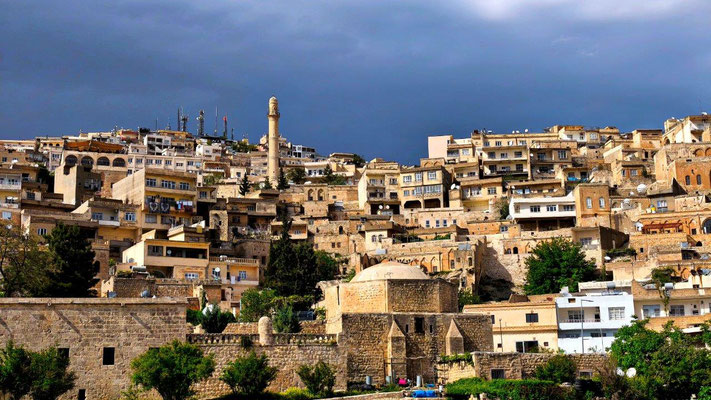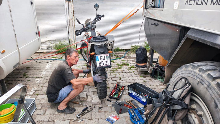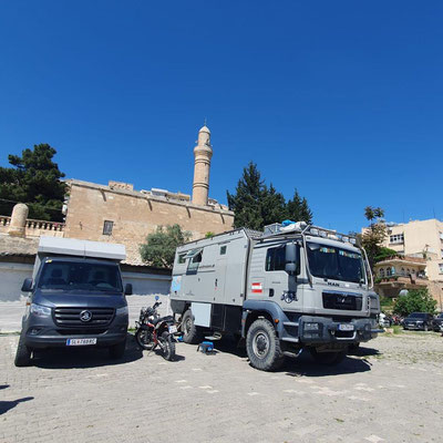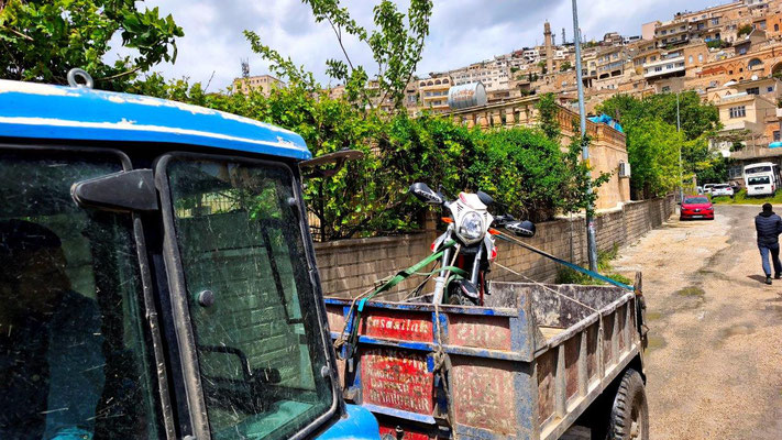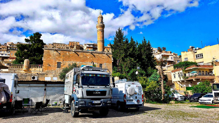 Wir erreichen Mardin. Eine historisch wunderschöne Stadt. Zuerst fahren wir zu MAN den Ventildeckel untersuchen. Die Werkstatt gleicht einer Spelunke, man ist aber sehr freundlich und hilft uns sofort. Nach Demontage finde ich 2 kleine Steine zwischen Deckel und Dichtfläche. Da haben die in Tbilisi ziemlichen Pfusch gemacht. Die Dichtung ist etwas beleidigt, eine neue gibt es nicht. So behelfen wir uns mit Silikon - hoffentlich ist es dicht. Oben in Mardin fahren wir auf einen zentralen Stellplatz, einige Overlander sind auch da. Noch stehen einige Reparaturen an, dann läuft die Mopette nicht. Zu dritt versuchen wir alles Mögliche - kein Erfolg. Und es regnet schon wieder. Irgendwie läuft es nicht so wie es soll ....