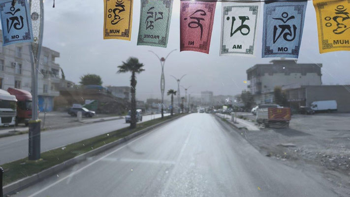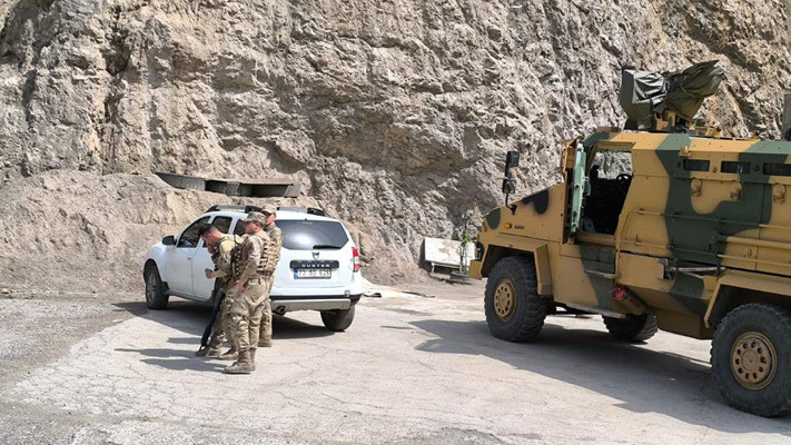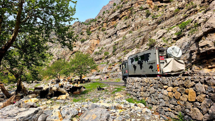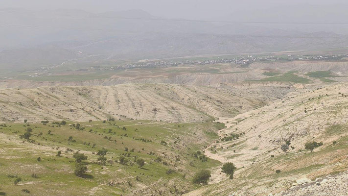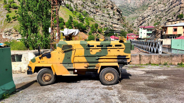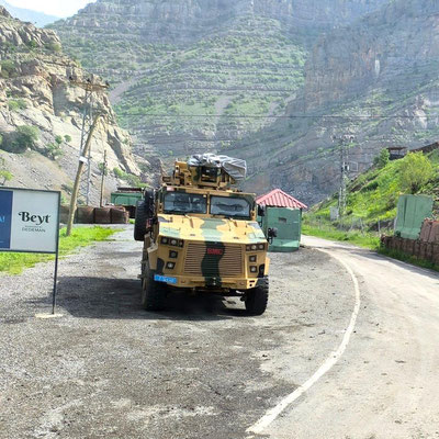 Unangenehme Piste von Hakkari bis Cicre. Dazu grau in grau - Sand ist in der Luft. Keine Sicht. Es geht entlang der irakischen und syrischen Grenze, immer wieder Militärkontrollen. Wir sind im tief muslimischen Kurdengebiet. Vieles ist hier noch Handarbeit. Die Strecke wäre schön, aber man sieht kaum etwas. Dafür drückende Temperaturen, in Cicre sind es nun 35 Grad. Bisher zu kalt - jetzt zu heiß. Am Abend bricht ein regelrechter Sandsturm über uns herein - wir sind nahe der syrischen Grenze. Wüstengebiet. Keine Chance, ein Fenster aufzumachen. In der Kabine sind's dann auch 33 Grad in der Nacht. Endlich finden wir einen money change – wir haben also Geld. Unser Versuch, uns für die Autobahngebühr zu registrieren, scheitert allerdings. Kinderfeiertag - alles geschlossen.
